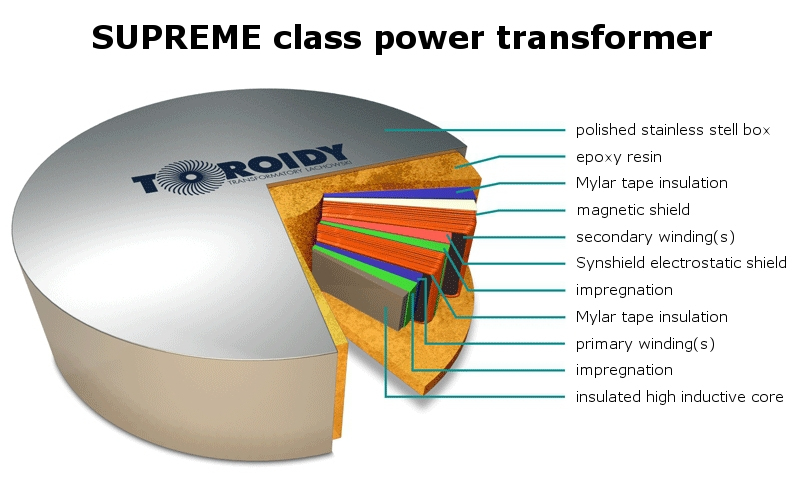 TOROIDY Supreme audio grade Transformatoren (EU Herstellung) sind speziell entwickelt für Einsetsung in High-End Audio Geräte. Sie empfangen ein geräuschloser Transformator, gewunden um ein Hochinductives, Laboratorium selectiertes und getester Kern. Für ein optimale Brumm und Rausch reduzierung sind der Kern und alle Windungen impregniert. Der Transformator ist auch ausgestattet mit elektrische und elektromagnetische Abschirmungen. Der ganze Transformator ist vacuum verpackt, mit Epoxy gefült in ein polierter, rostfrei Stahlbuchse.
