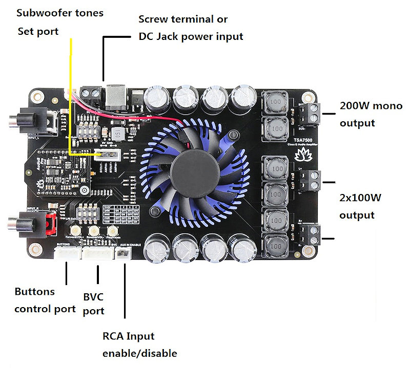 TSA7500 2x100W + 220W 2.1 channels audio amplifier board with AudioB pro Bluetooth module. It has perfect class-D architecture (Texas Instruments TPA3221) and 2 channels have 100W power output and another one channel has 200W power output. All the channels are capable of outputting nominal power simultaneously and continuously. This board can be powered by any DC12V-30V power supply. It can be used to drive any 4Ω or 8Ω passive speakers (subwoofer channel need 2Ω or 4Ω). TSA7500 can also be connected with our TSA1000,TSA1010 or TSA1020 external audio volume control board. People can adjust the audio volume by rotating the real knob. It's a 2.1 channels amplifier board. The channel for subwoofer is 200W mono output. You can pair it with a mobile phone or a computer, etc.. Power the amplifier board. Use your phone or PC, etc. to search for a new Bluetooth device. The module will appear as "TSA7500". You don't need a PIN, pair it and then you can play music.