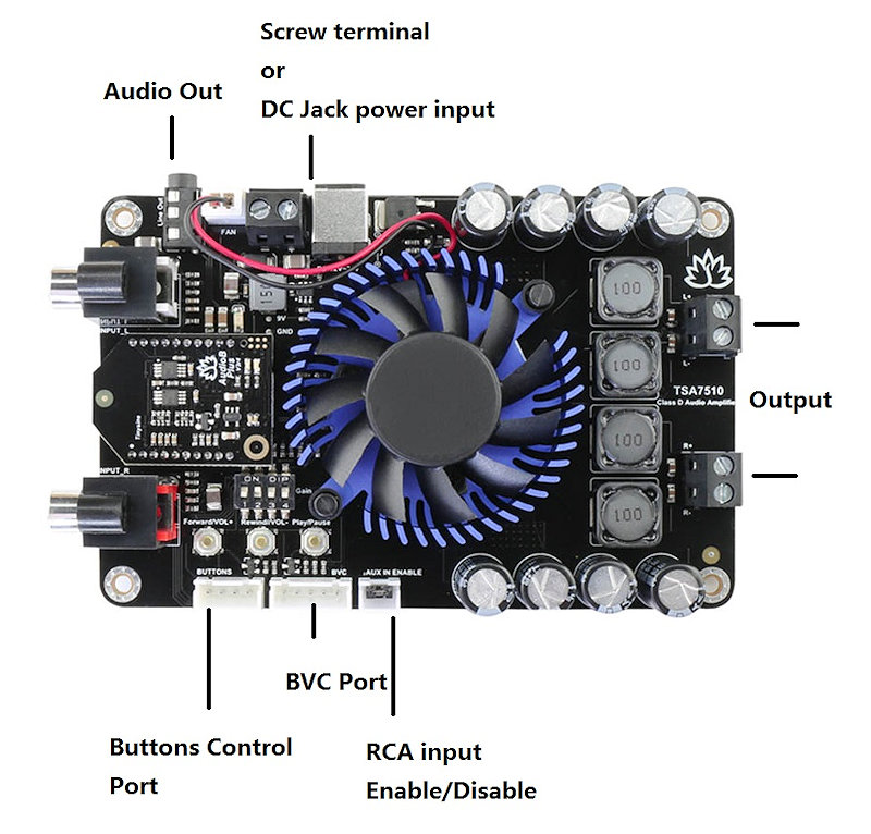 TSA7510 2x100W audio amplifier board with AudioB plus Bluetooth module. It has perfect class-D architecture (Texas Instruments TPA3221) and each channel has 100W power output. Both of the channels are capable of outputting nominal power simultaneously and continuously. This board can be powered by any DC12V-30V power supply. It can be used to drive any 2Ω,4Ω or 8Ω passive speakers. TSA7510 can also be connected with our TSA1000,TSA1010 or TSA1020 external audio volume control board. People can adjust the audio volume by rotating the real knob. It's perfect for your Hi-Fi application. You may wish to pair with a mobile phone or a computer, etc.. Power the amplifier board. Use your phone or PC, etc. to search for a new Bluetooth device. The module will appear as "TSA7510". You don't need a PIN, pair it and then you can play music.