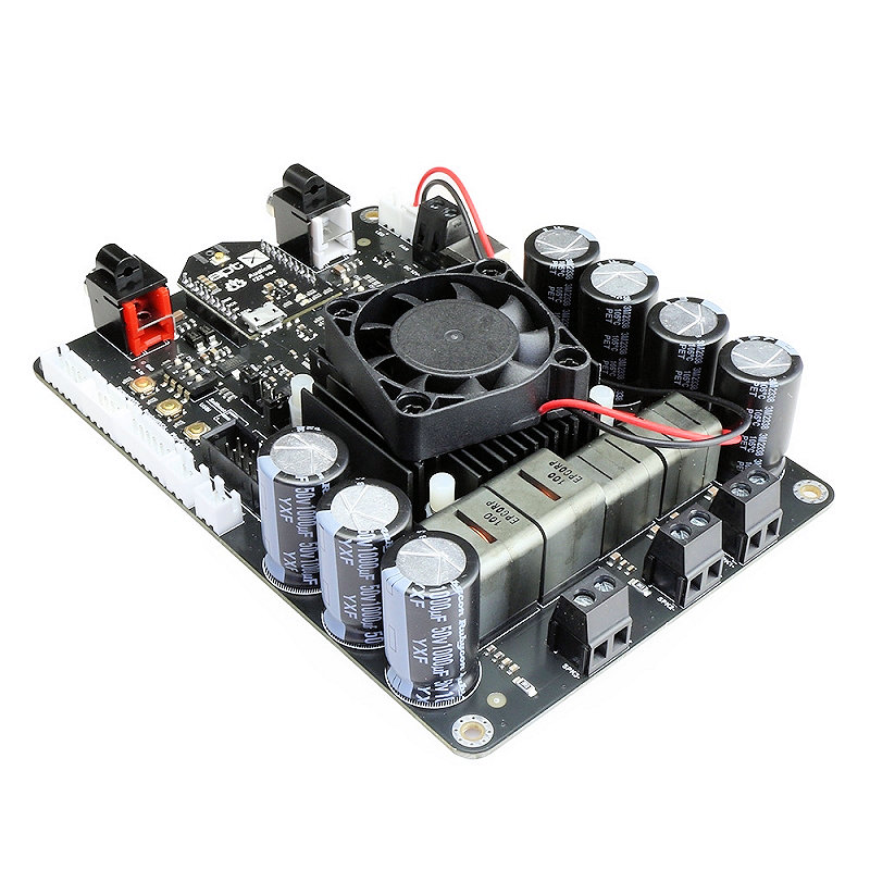 TSA8800B 2x100W + 200W 2.1 channels Bluetooth+DSP amplifier board with an AudioB I2S Bluetooth module that supports Apt-X. TSA8800B is a very flexible DSP/DAC/Amplifier combination board. It has perfect class-D architecture (based on Texas Instruments TPA3221) and 2 channels have 100W power output and another one channel has 200W power output. All the channels are capable of outputting nominal power simultaneously and continuously. This board can be powered by any DC12V-30V power supply. It can be used to drive any 4Ω or 8Ω passive speakers (subwoofer channel can drive 2Ω speaker). It's a 2.1 channels amplifier board. The channel for subwoofer is 200W mono output (users can change the DSP program to let it become right or left channel or mixed output). You can pair it with a mobile phone or a computer, etc.. Power the amplifier board. Use your phone or PC, etc. to search for a new Bluetooth device. The module will appear as "TSA8800B". You don't need a PIN, pair it and then you can play music. The highlight point is Analog Devices ADAU1701 DSP chip on board. User can set each channel audio tones separately. Apt-X and TWS supported. Therefore, users can stream audio to 2 paired amplifier boards at the same time wirelessly.