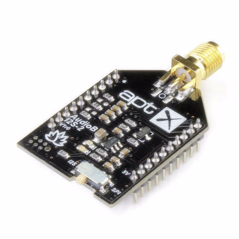 If you want to build a digital Bluetooth amplifier board. AudioB I2S Bluetooth audio receiver module is a good choice for your project. This is a Bluetooth 5.0 stereo receiver module, I2S digital output and music resampling frequency is 48KHz. It supports Apt-X, and is based on Qualcomm CSRA64215. Breakout pins are used to 2x10 2mm space male pins. You can integrate it to your project easily. This module has a SMA connector. You can connect an external 2.4GHz antenna with it.