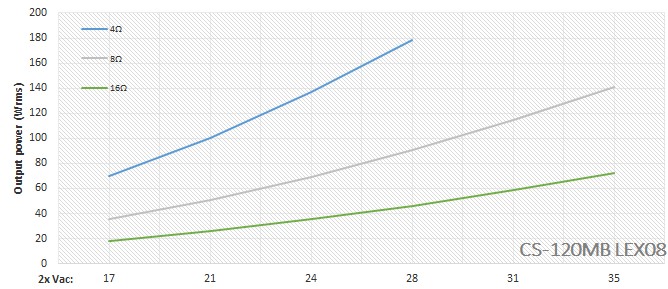 Plm. 120Wrms/4Ω, inkl. on-board Netzteil.