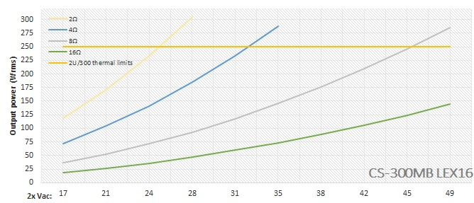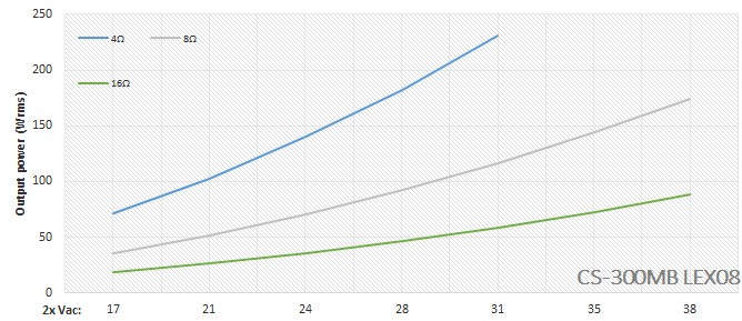 Plm. 300Wrms/4Ω, inkl. on-board Netzteil.