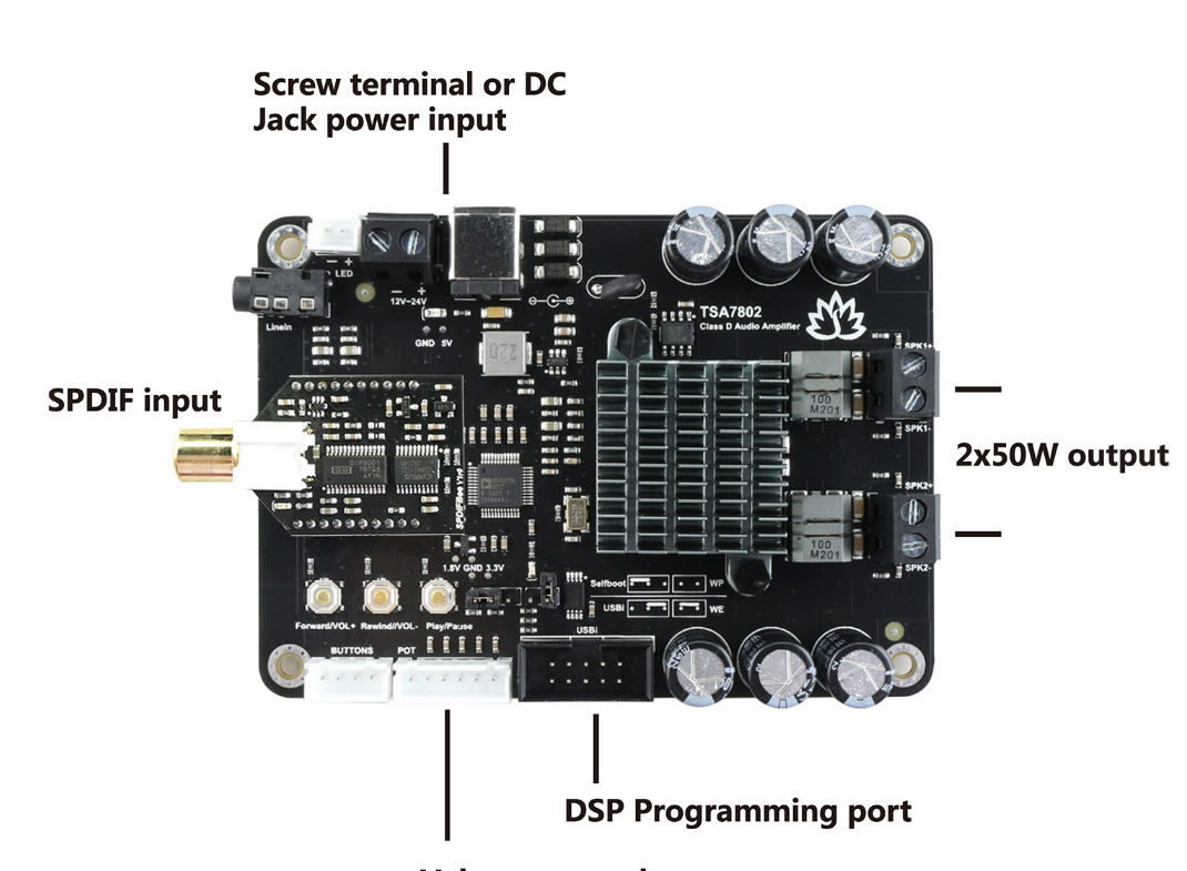 TSA7802C 2x50W 2 channels SPDIF+DSP digital amplifier board with a SPDIFBee receiver module. SPDIFBee convert the SPDIF signal to I2S signal and output to the ADAU1701 DSP chip. TSA7802C is a very flexible DSP/DAC/Amplifier combination board. It has perfect class-D structure (Texas Instruments TPA3116D2) and 2 channels have 50W power output. All the channels are capable of outputting nominal power simultaneously and continuously. This board can be powered by any DC12V-24V power supply. It can be used to drive any 4Ω or 8Ω passive speakers. It's a 2 channels amplifier board. It has a coaxial input connector on the board which can accept different sampling rates digital audio source, from 16bit 44.1KHz to 24bit 96KHz. The main DSP chip on this amplifier board is Analog Devices ADAU1701. It has a default DSP program loaded. Customers can adjust the gain, bass, midrange and treble in the DSP program. It also has a debug port for Sigima Studio, and user can program this module with our USBi programmer to get more functions that include equalization, crossover, bass enhancement, multiband dynamics processing, delay compensation, etc.