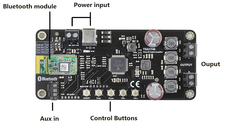 TSA1740 is a 2x20W Bluetooth 5.0 audio amplifier board. It has a digital amplifier chip YDA174 on the board. It is a 20W×2ch high performance digital audio power amplifier IC with two DSPs. This board can be powered by any DC10V-18V power supply. It can be used to drive any 4Ω or 8Ω passive speakers. It's perfect for your Hi-Fi application. You may wish to pair with a mobile phone or a computer, etc.. Power the amplifier board. Use your phone or PC, etc. to search for a new Bluetooth device. The module will appear as "TSA1740". You don't need a PIN, pair it and then you can play music. The highlight point is you can connect multi TSA1740 to let them work together. It's a Bluetooth network. When you set the board to "party mode", users can stream audio to many amplifier boards at the same time wirelessly.