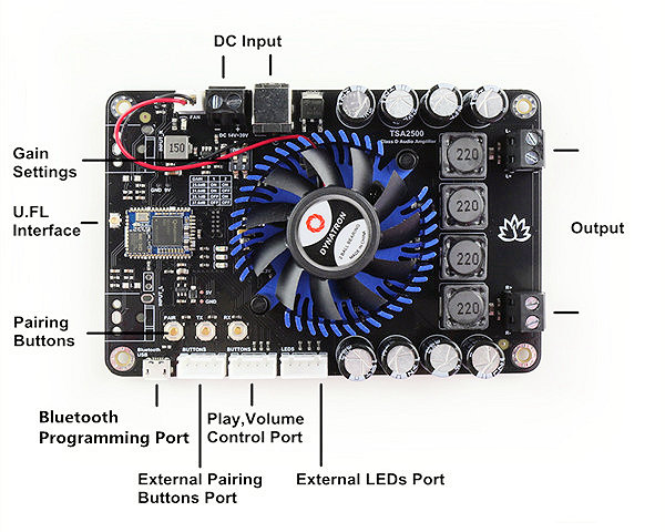 TSA2500 is a 2x100W Stereo Bluetooth 5 multipoint audio amplifier board. It has perfect class-D architecture (based on ST TDA7498) and each channel has maximum 100W power output. Both of the channels are capable of outputting nominal power simultaneously and continuously. This board can be powered by any DC14V-39V power supply. it can be used to drive any 4Ω or 8Ω passive speakers. The highlight point is BT 5 integrated. You can have many TSA2500 boards paired and work together. TSA2500 can remember the pairing info. You don't need to pair them each time after you turn the amplifier board on. This makes it possible to build a wireless surround sound system by using the TSA2500. If you only use one TSA2500, it can work as a common Bluetooth amplifier board. Power the amplifier board. Double click PAIR button to set the board into Pairing mode. Use your phone or PC, etc. to search for a new Bluetooth device. The module will appear as "TSA2500". You don't need a PIN, pair it and then you can play music.