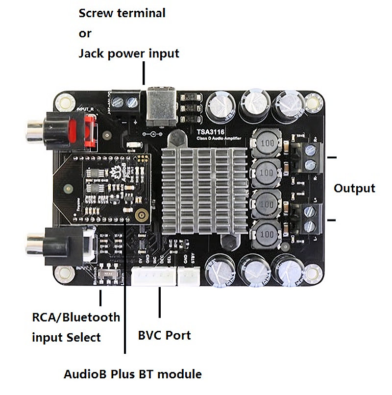 This is a 2x50W audio amplifier board with AudioB plus Bluetooth module. It has perfect class-D architecture (Texas Instruments TPA3116D2) and every channel has 50W power output. Both of the channels are capable of outputting nominal power simultaneously and continuously. This board can be powered by any DC10V-24V power supply, it can be used to drive any 4Ω or 8Ω passive speakers. It's perfect for your Hi-Fi application, the audio source can be RCA or Bluetooth. You may wish to pair with a mobile phone or a computer, etc.. Power the amplifier board. Use your phone or PC, etc. to search for a new Bluetooth device. The module will appear as "BT Speaker". You don't need a PIN, pair it and then you can play music.