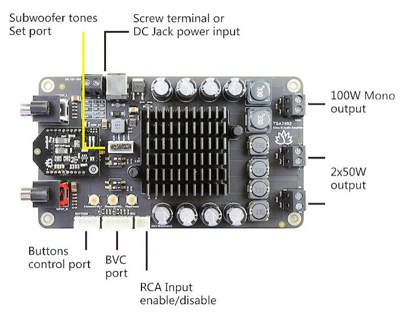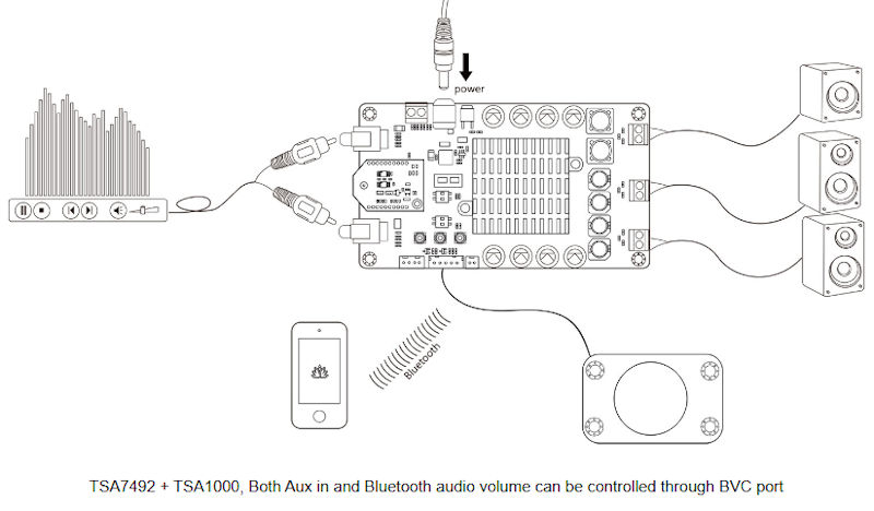 TSA7492 2x50W + 100W 2.1 channels audio amplifier board with AudioB pro Bluetooth module. It has perfect class-D architecture (based on TDA7492 and TDA7498) and 2 channels have 50W power output and another one channel has 100W power output. All the channels are capable of outputting nominal power simultaneously and continuously. This board can be powered by any DC12V-26V power supply. It can be used to drive any 4Ω or 8Ω passive speakers. TSA7492 can also be connected with our TSA1000,TSA1010 or TSA1020 external audio volume control board. People can adjust the audio volume by rotating the real knob. It's a 2.1 channels amplifier board. The channel for subwoofer is 100W mono output. You can pair it with a mobile phone or a computer, etc.. Power the amplifier board. Use your phone or PC, etc. to search for a new Bluetooth device. The module will appear as "TSA7492". You don't need a PIN, pair it and then you can play music. TSA7492 can automatically detect the Aux in/Line in Audio input. Bluetooth Audio source has a higher priority. When Bluetooth audio is paused or bluetooth is disconnected, the amplifier will output the Aux in/Line in audio. There is an audio connnector that can connect with an external DSP to set the subwoofer audio tones.