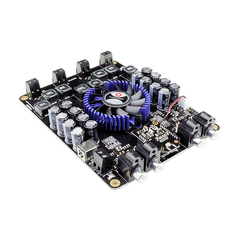 This is a 4x100W audio amplifier board with AudioB plus Bluetooth module. It's integrated 2xST high performance based on TDA7498 which support dual channel audio amplification. Each channel is capable of outputting nominal power simultaneously and continuously. This board can be powered by any DC14V-39V* power supply. Power input port can be power jack or screw terminal. The DC input jack is 2.5mm with positive core polarity, And if you use screw terminal, please pay attention to the polarity! It has a smart cooling system, and the fan does not work in normal cases to reduce the noises. Only starts when the chip temperature > 65°C. Once the temperature goes down, the fan stop running. It's perfect for your Hi-Fi application, the audio source can be RCA input or Bluetooth. Compatible with all Bluetooth devices that support media audio, including iPhone,Android. Let your smartphone paired with this board, play a music.