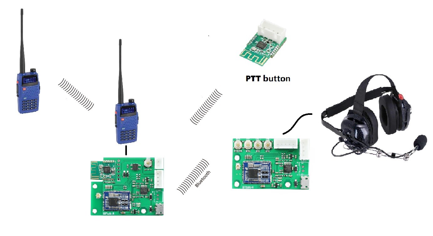 This is a full duplex bluetooth voice communication kit for 2 way radios. A wired headset is connected with the biggest board (TSA5003). Another board TSA5004 is connected with the 2 way radio. The smallest module is the wireless PTT button.