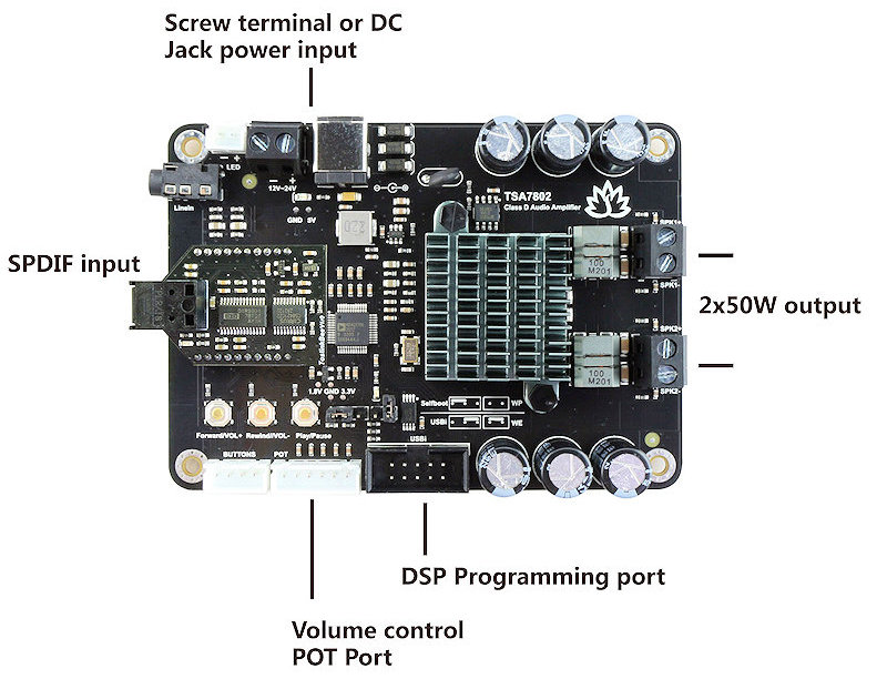 TSA7802D 2x50W 2 channels SPDIF+DSP digital amplifier board with a TOSLINKBee receiver module. TOSLINKBee convert the SPDIF optical signal to I2S signal and output to the Analog Devices ADAU1701 DSP chip. TSA7802D is a very flexible DSP/DAC/Amplifier combination board. It has perfect class-D structure (Texas Instruments TPA3116D2) and 2 channels have 50W power output. All the channels are capable of outputting nominal power simultaneously and continuously. This board can be powered by any DC12V-24V power supply. It can be used to drive any 4Ω or 8Ω passive speakers. It's a 2 channels amplifier board. It has a optical input connector on the board which can accept different sampling rates digital audio source, from 16bit 44.1KHz to 24bit 96KHz. The main DSP chip on this amplifier board is ADAU1701. It has a default DSP program loaded. Customers can adjust the gain, bass, midrange and treble in the DSP program. It also has a debug port for Sigima Studio, and user can program this module with our USBi programmer to get more functions that include equalization, crossover, bass enhancement, multiband dynamics processing, delay compensation, etc.
