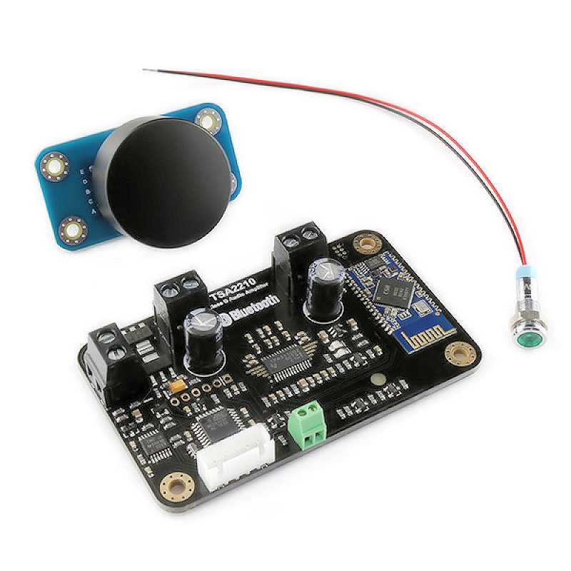 This kit is designed for factory or DIY user. A volume knob, weatherproof panel mount LED and a TSA2210 amplifier board are included in this kit. People can adjust the bluetooth audio volume either on the smartphone or turning this real knob. You can power this kit with a 12VDC power supply or a 12V battery. The LED can indicate the ON/OFF state and the battery voltage state. Users can install this kit in a box easily to make their own audio amplifier products. TSA2210 is a 2x8W class D audio amplifier board with Bluetooth 4.0 integrated. It has perfect class-D architecture (based on Texas Instruments TPA3110D2) and every channel has 8W power output. This board can be powered by any DC8V-16V power supply. It can be used to drive any 4Ω or 8Ω passive speakers. The bluetooth audio volume control circuit is also integrated on this board. Turn the knob clockwise will increase volume, Turn the knob counterclockwise will decrease volume. Click the knob will turn ON/OFF the amplifier. It's perfect for your Hi-Fi application. You may wish to pair with a mobile phone or a computer, etc.. Power the amplifier board. Use your phone or PC, etc. to search for a new Bluetooth device. The module will appear as "BT Speaker"( You can also change the BT name if you have a programmer). You don't need a PIN, pair it and then you can play music.