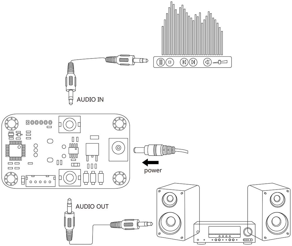 TSA1010 is a digital stereo Bluetooth/Single-ended audio volume controller board. It has two 3,5mm audio jack and a BVC port (only for some Tinysine Bluetooth amplifier board). You can use it to control any normal amplifier board audio volume. The audio out signal will increase/decrease when user rotates the knob, Bluetooth audio volume control port will also output a control signal increase/decrease.